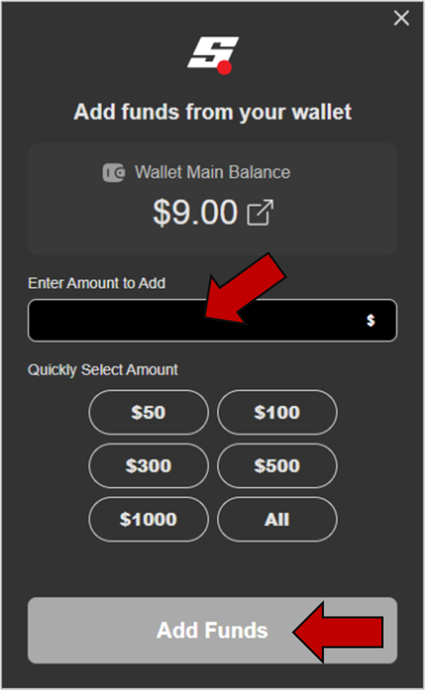 - A new window will appear, allowing you to input the desired amount you wish to add. Alternatively, you can opt for one of the suggested preset amounts. If you prefer to add all available funds to your wallet, simply click the “All” option.